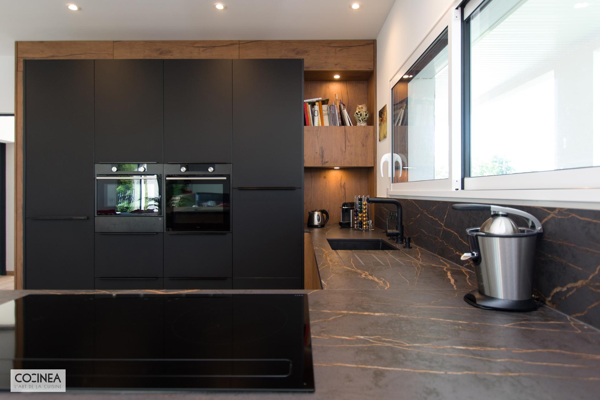 Chez COCINEA, la qualité des matériaux est une obsession. La réalisation d'une cuisine sur mesure en Kappa noir Mat et dekton Laurent marque Armony à Blagnac est la meilleure illustration de cette philosophie. Imaginé par Wilfried DE ALMEIDA, ce projet met à l'honneur des façades en Armony Noir Mat – un matériau qui a l'avantage d'être anti-traces de doigts et de présenter une résistance accrue aux coups et aux rayures du quotidien. L'îlot central, véritable cœur de cette cuisine à Blagnac 31700, est magnifié par un plan de travail en Dekton Laurent de chez Cosentino. Son rendu visuel, avec un veinage sombre très marqué, est absolument spectaculaire.