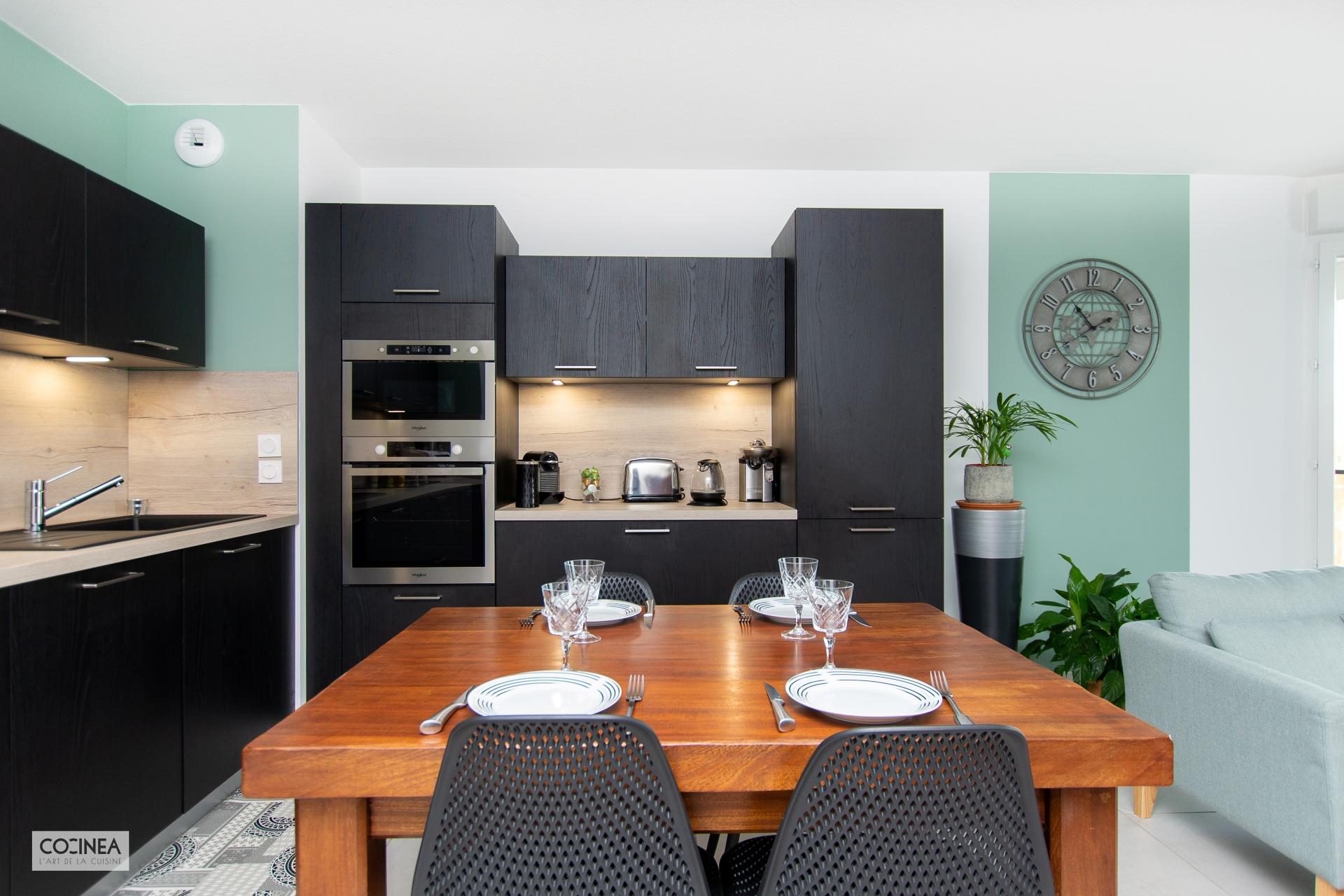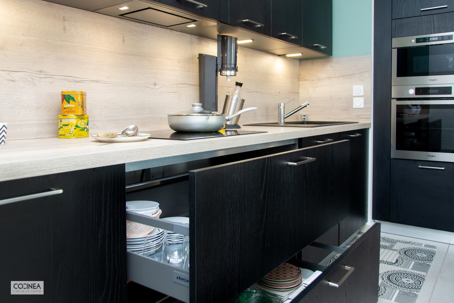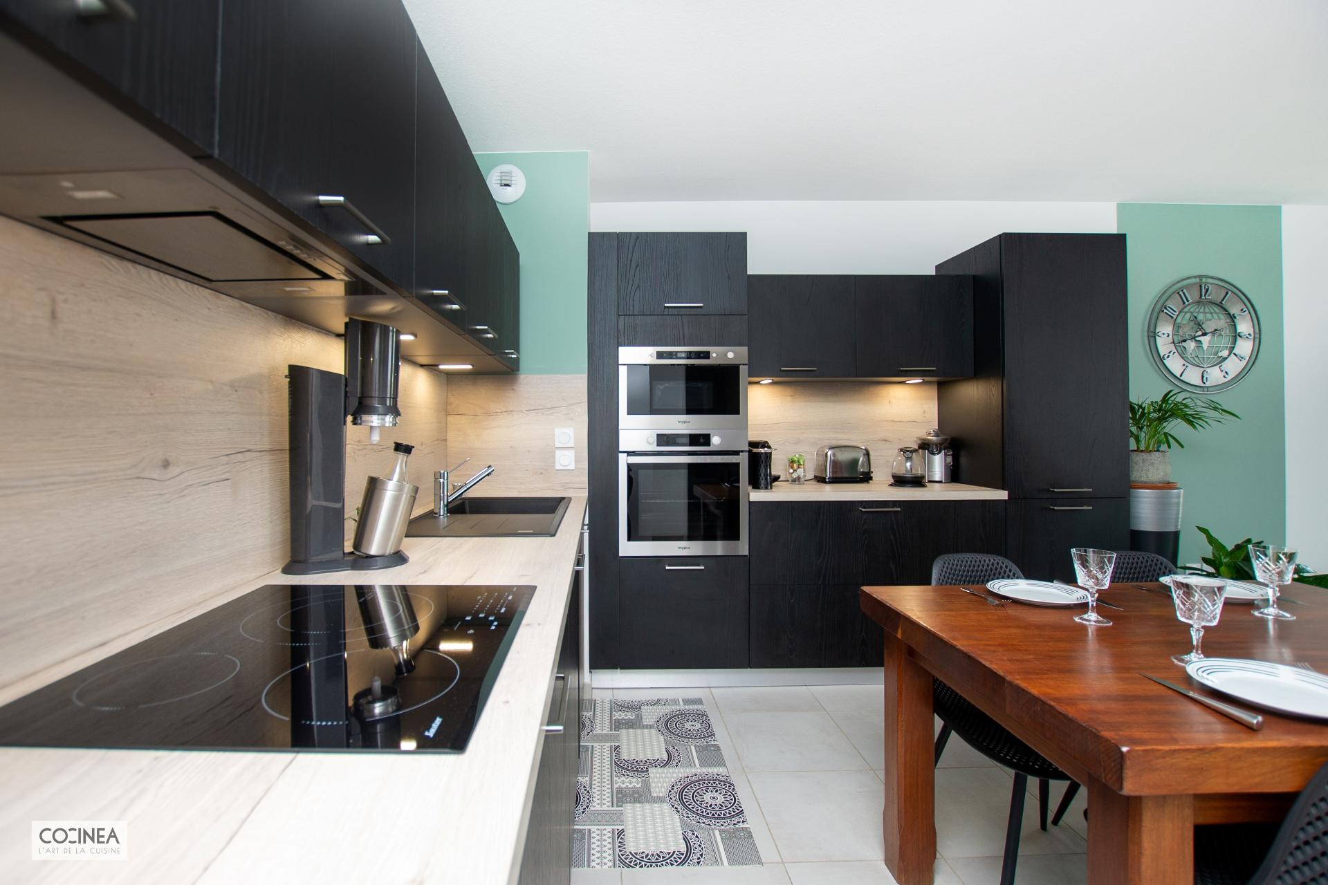 Concernant l’électroménager, l’ensemble four et micro-ondes Whirlpool permet de faire un rappel entre l’inox et le noir pour s’intégrer parfaitement avec la cuisine.