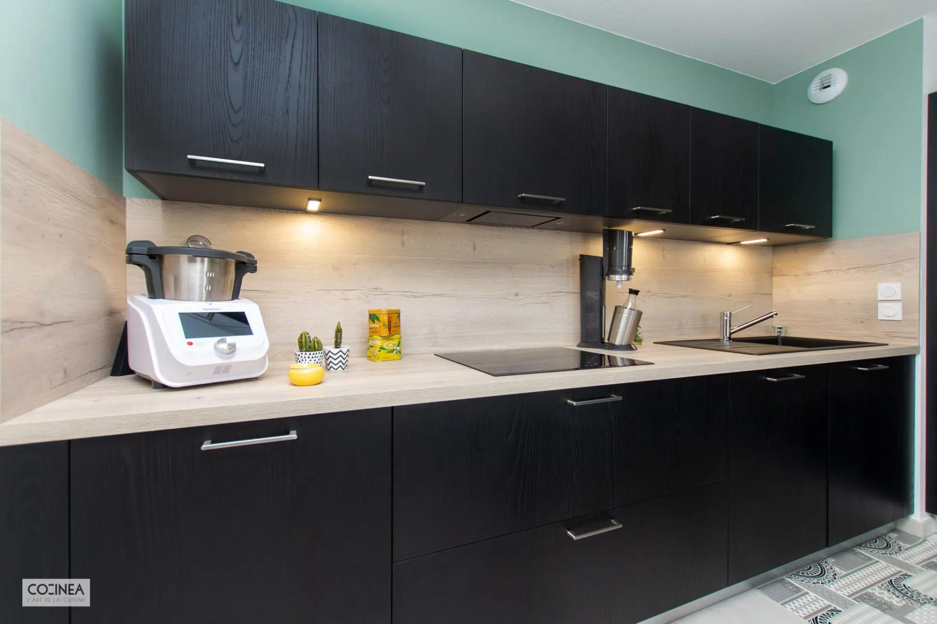 Voici une réalisation de Ana Musard, ce projet est une cuisine Armony finition Rovere Dark avec poignées « Cliff » inox qui se marie parfaitement avec le mitigeur « Sirius » et l’évier « Malta » finition graphite de notre fournisseur Franke.