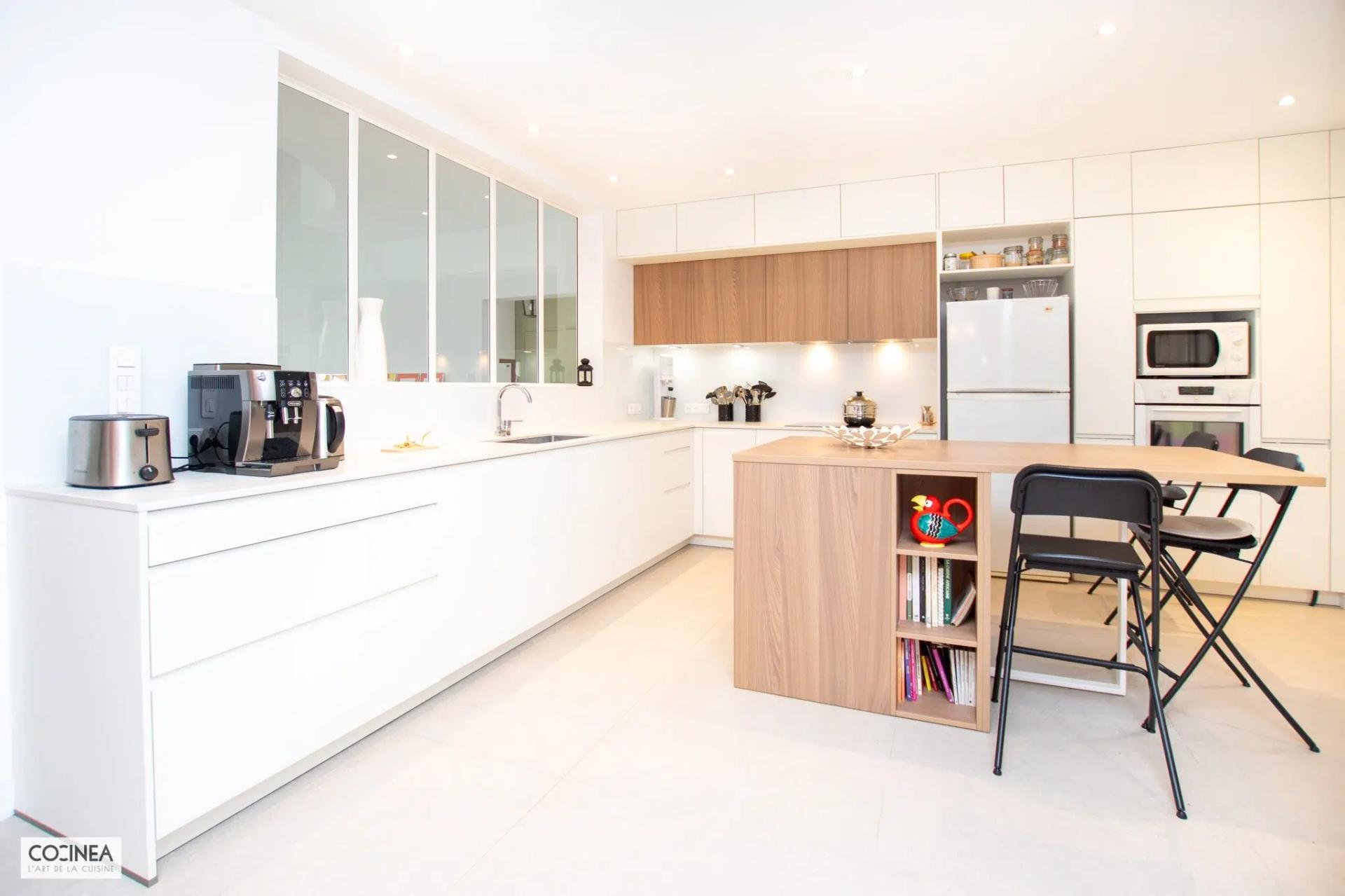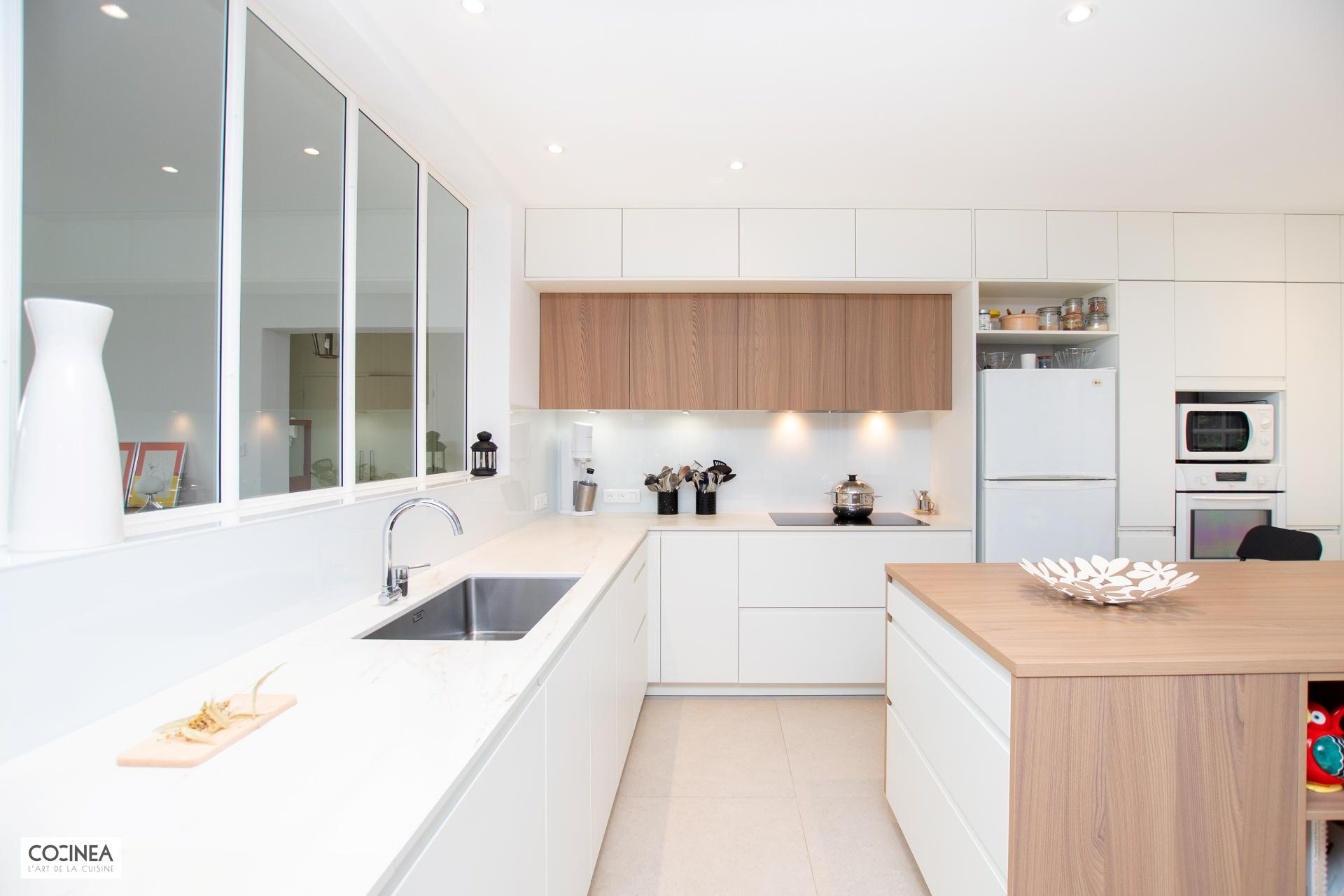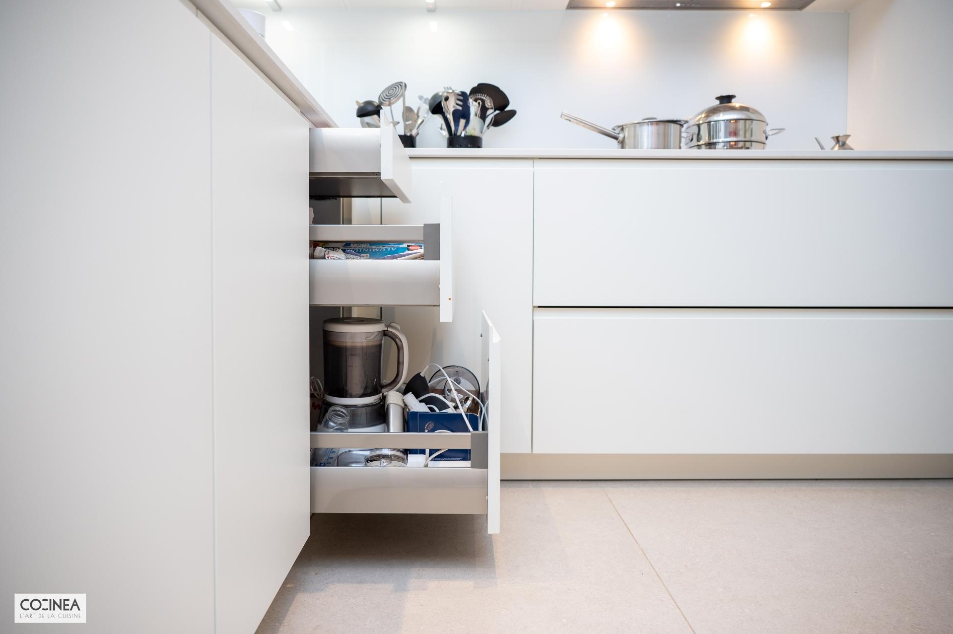 Cocinea vous présente une réalisation de Wilfried De Almeida, cette cuisine moderne et intemporelle a été conçue avec notre fournisseur Hacker et sa gamme « Luna Max » avec poignée intégrée pour les meubles laqué blanc.