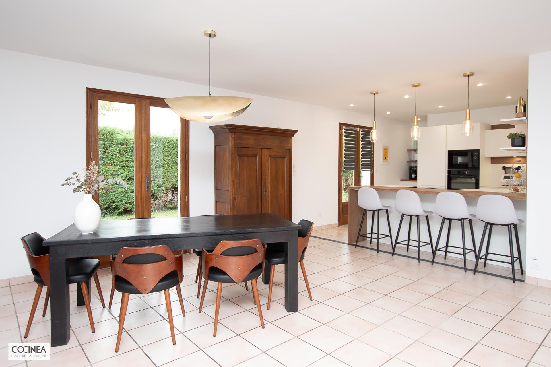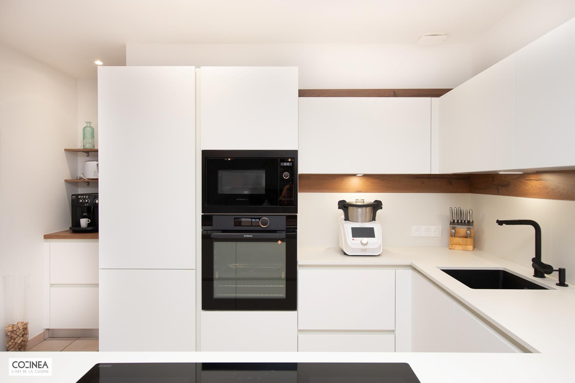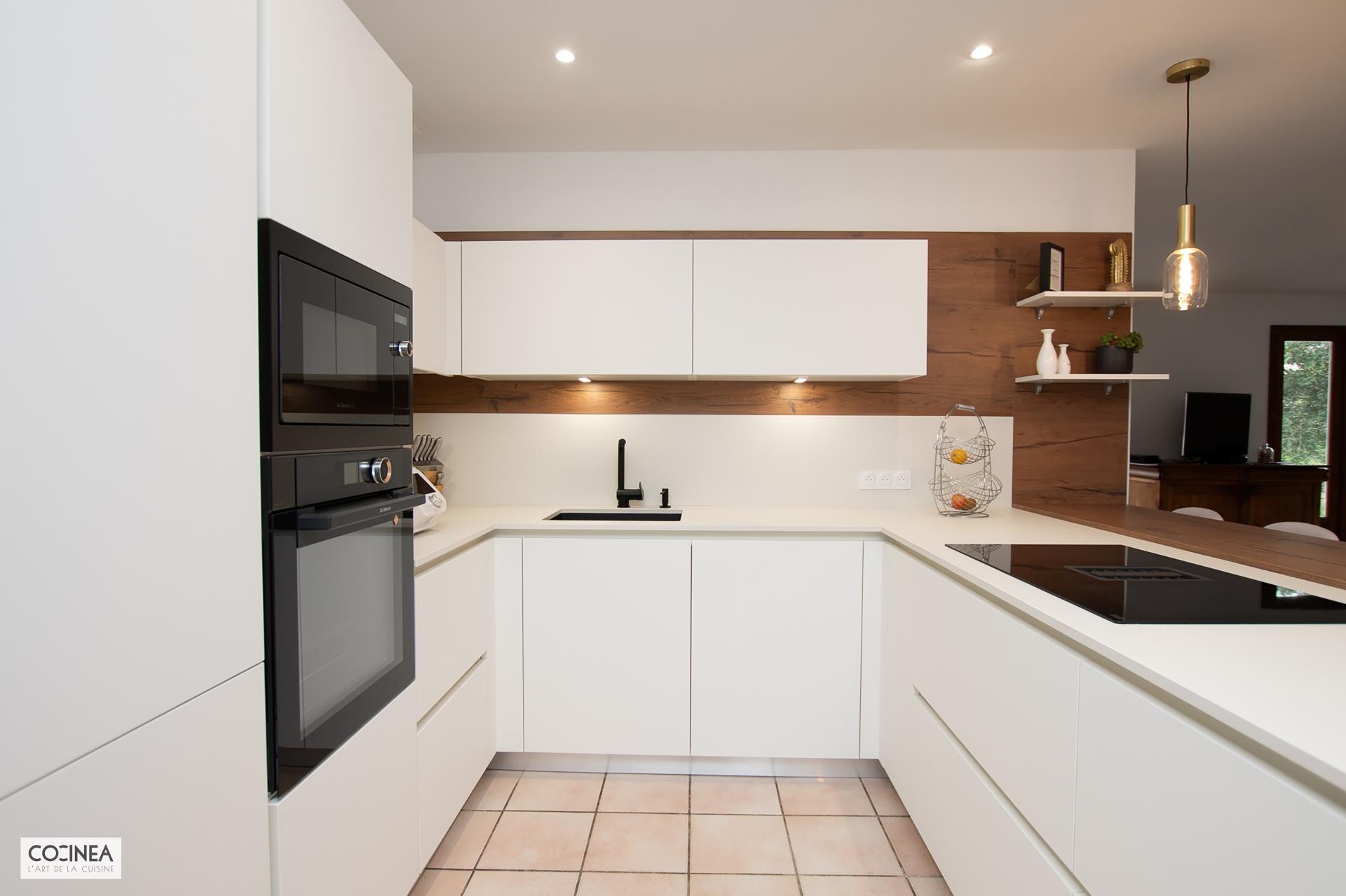 Nous vous présentons une réalisation de COCINEA : une cuisine sans poignée ARMONY avec des façades Kappa-X White Matt. Le coin repas ainsi que la crédence finition Rho-Split Brown s’harmonisent parfaitement avec les menuiseries existantes et créent une ambiance chaleureuse et conviviale.